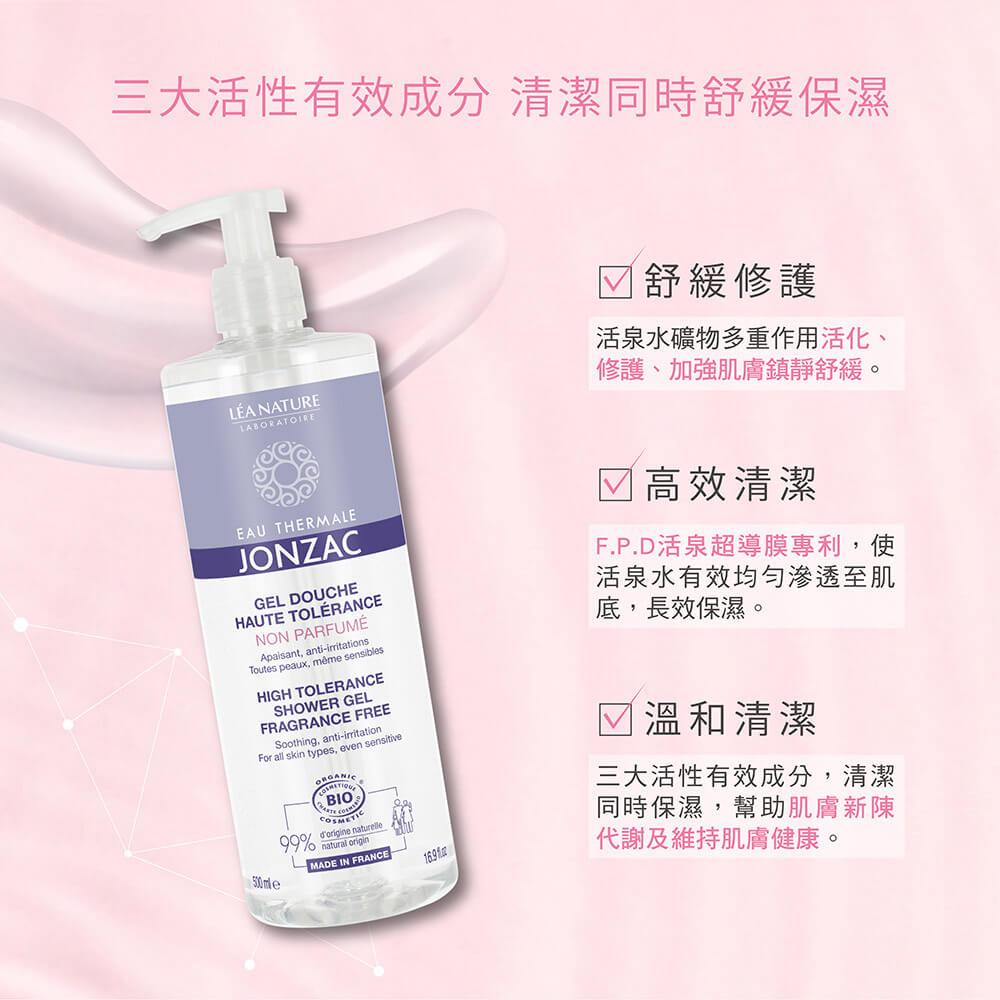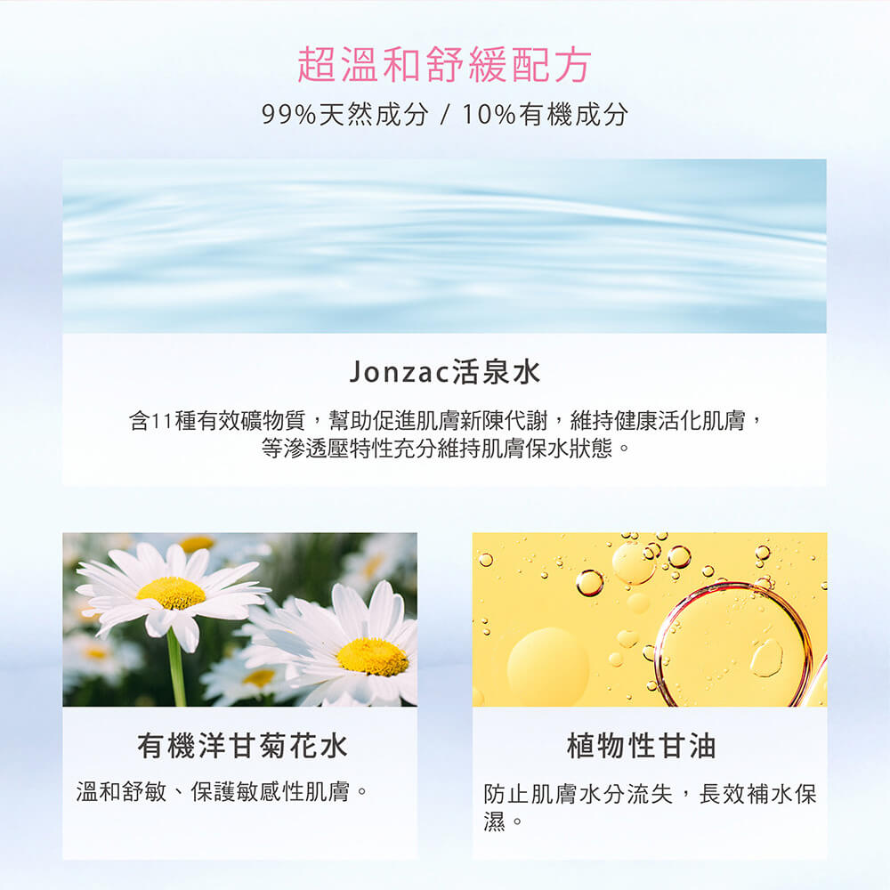 全世界唯一擁有有機認證活泉品牌;無香精、無酒精低敏配方,專為敏感肌設計。含法國Jonzac活泉水、有機洋甘菊花水以、專利F.P.D.活泉超導膜及多重植萃保濕配方,溫和洗淨同時舒緩、修復肌膚。