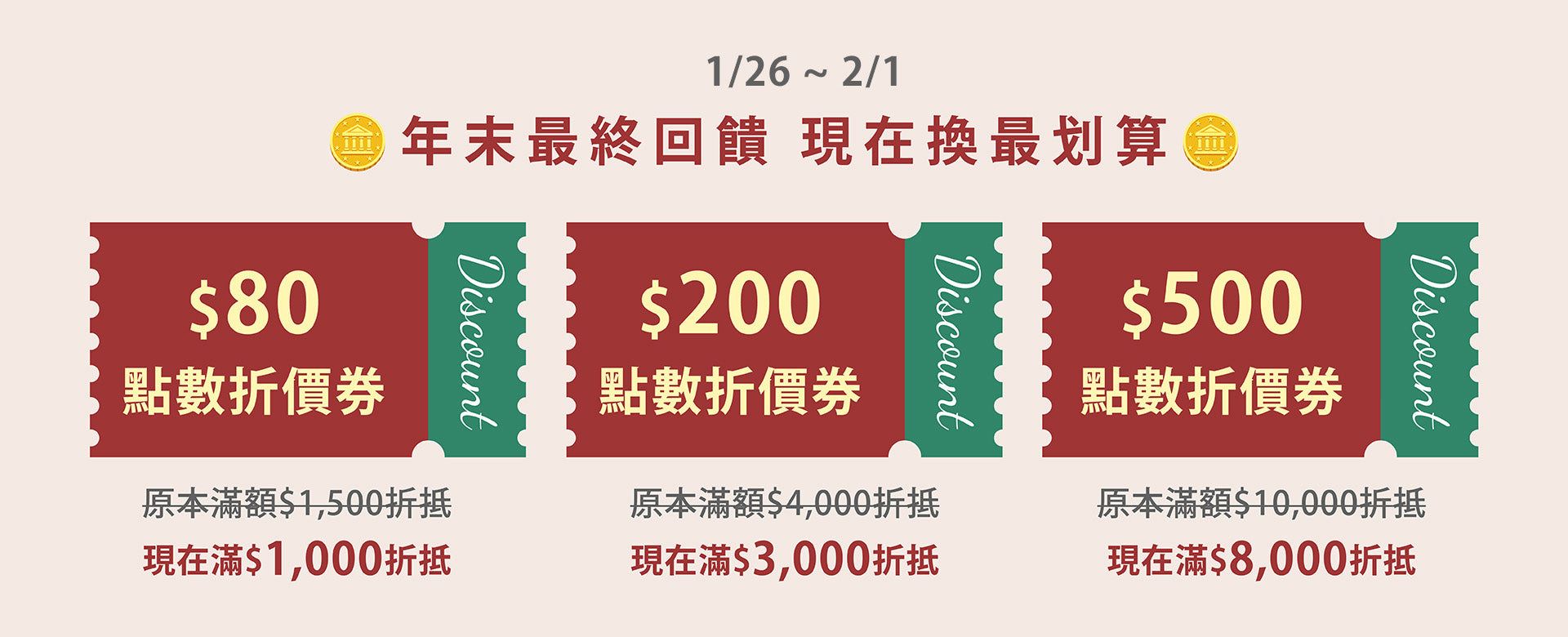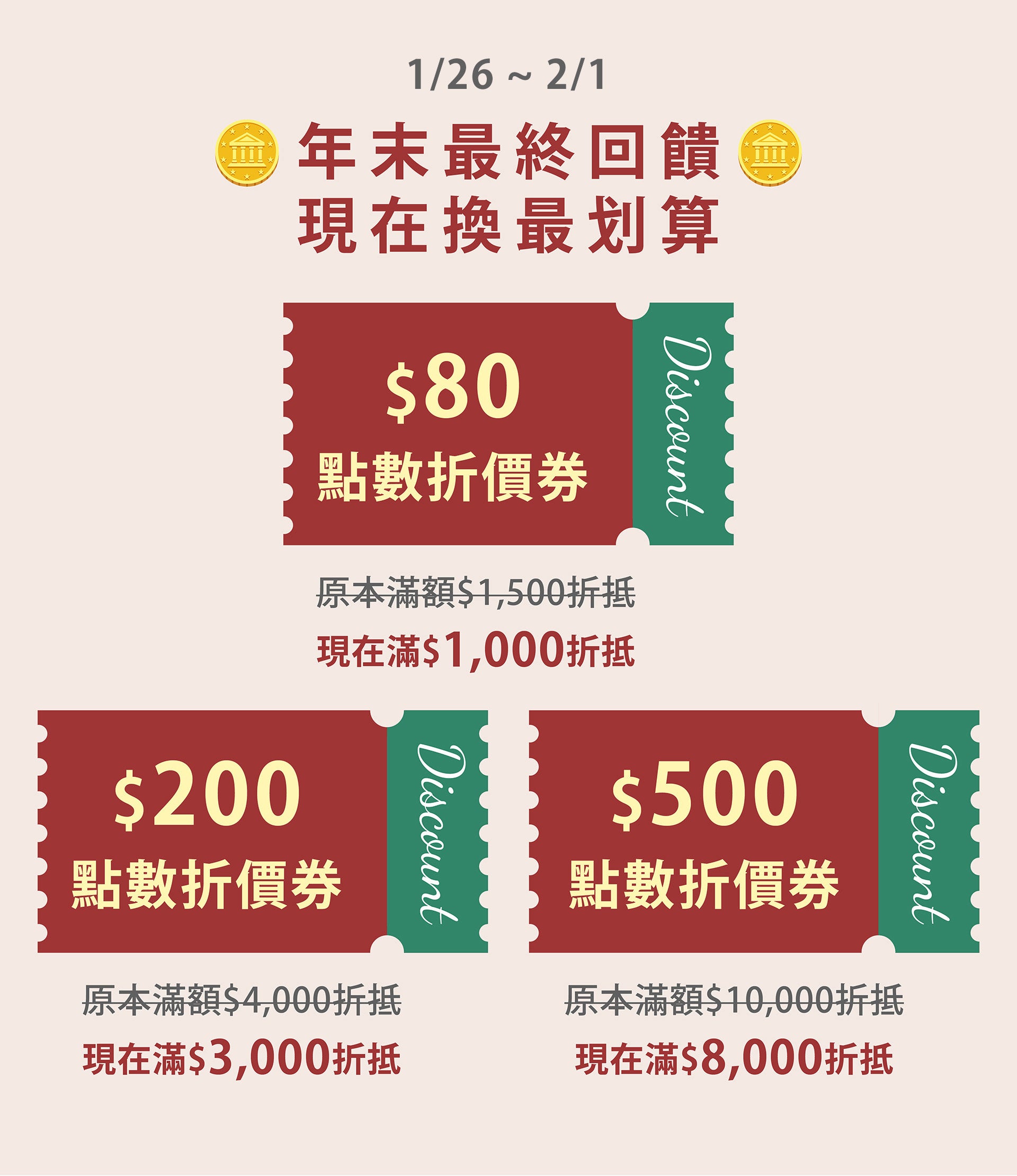 ✨兌換的折價券僅能使用1張,兌換後點數不會退回。請選擇合適的折價券進行兌換!