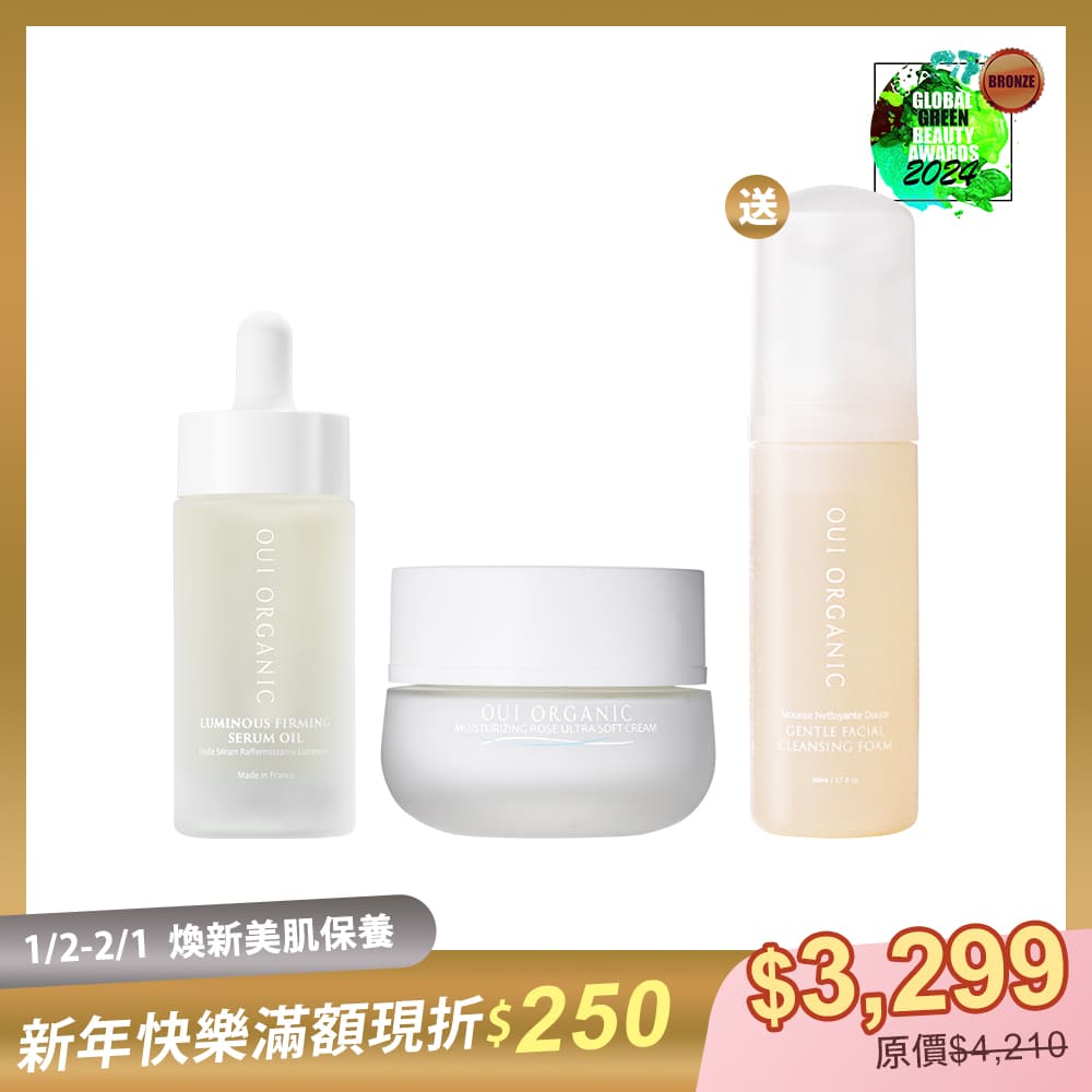 - 組合內容:法國緊緻活顏亮采精華油30mL+法國絲絨玫瑰時光活膚乳50mL+小慕斯50mL