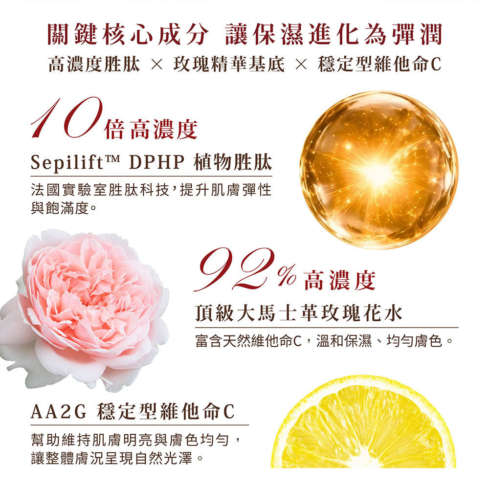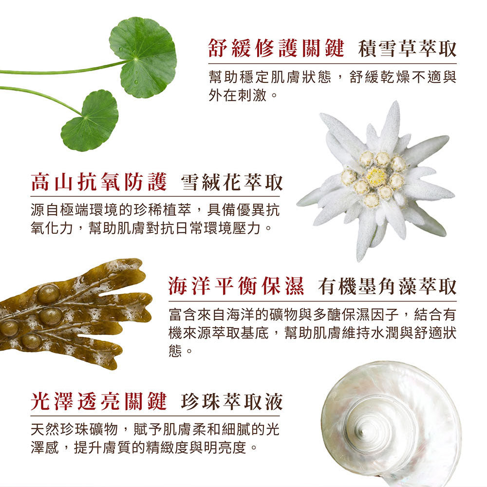 - 植物胜肽彈潤 × 積雪草修護 協助提升肌膚彈潤度與細緻度,並幫助穩定膚況、舒緩不適。